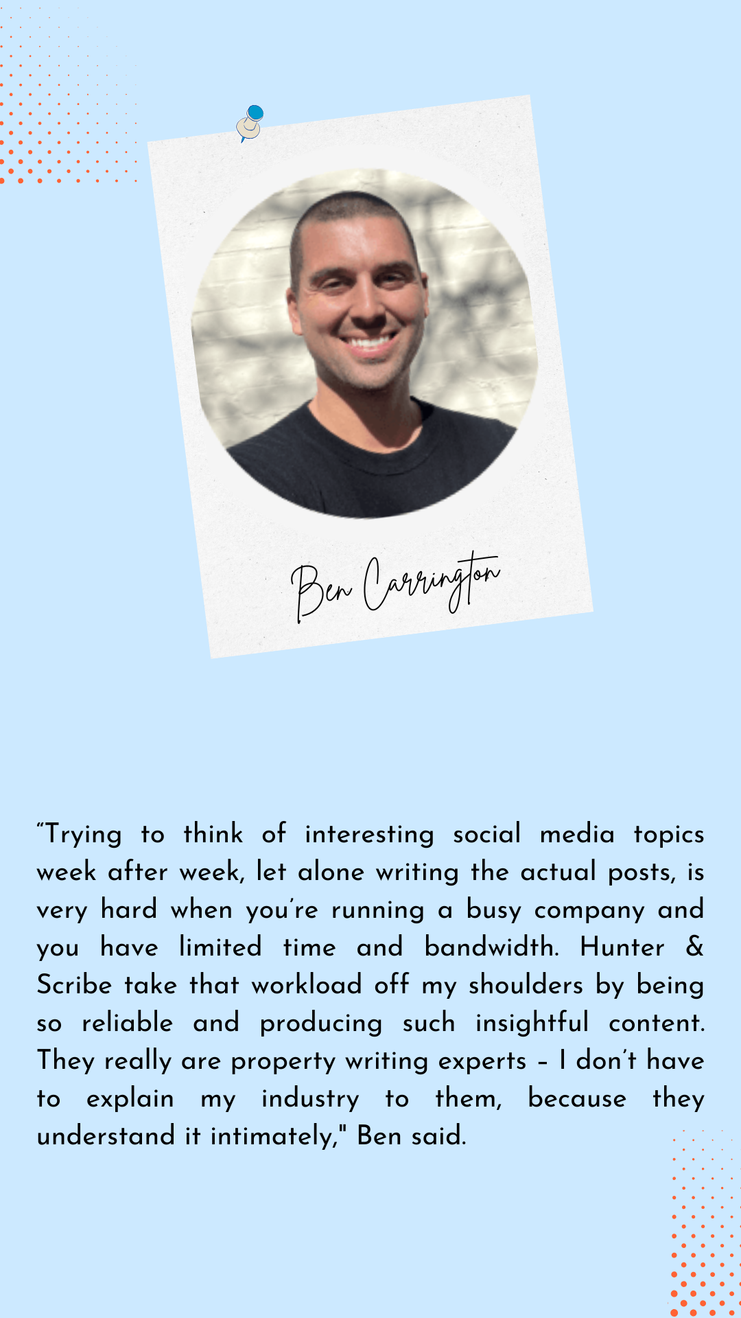 “Trying to think of interesting social media topics week after week, let alone writing the actual posts, is very hard when you’re running a busy company and you have limited time and bandwidth. Hunter & Scribe take that workload off my shoulders by being so reliable and producing such insightful content. They really are property writing experts – I don’t have to explain my industry to them, because they understand it intimately,” Ben said.