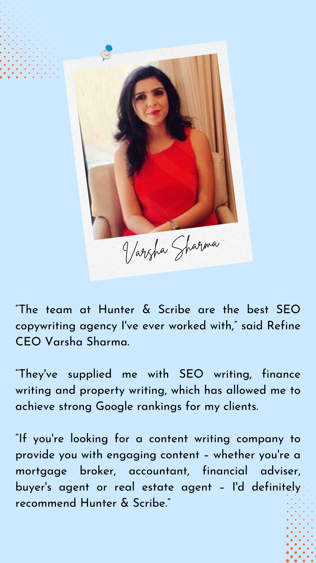 “If you’re looking for a content writing company to provide you with engaging content – whether you’re a mortgage broker, accountant, financial adviser, buyer’s agent or real estate agent – I’d definitely recommend Hunter & Scribe.”
