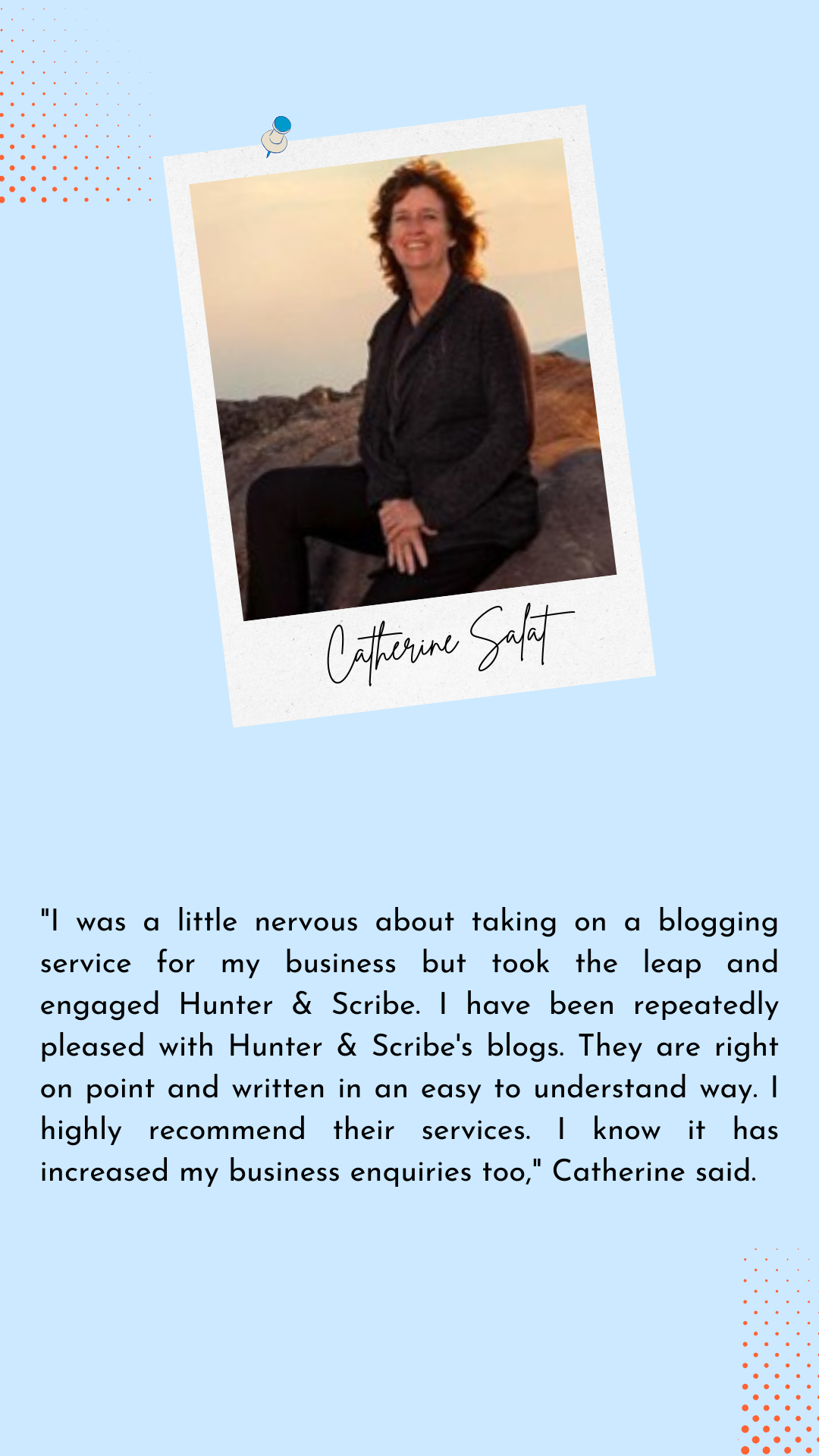 “I was a little nervous about taking on a blogging service for my business but took the leap and engaged Hunter & Scribe. I have been repeatedly pleased with Hunter & Scribe’s blogs. They are right on point and written in an easy to understand way. I highly recommend their services. I know it has increased my business enquiries too,” Catherine said.
