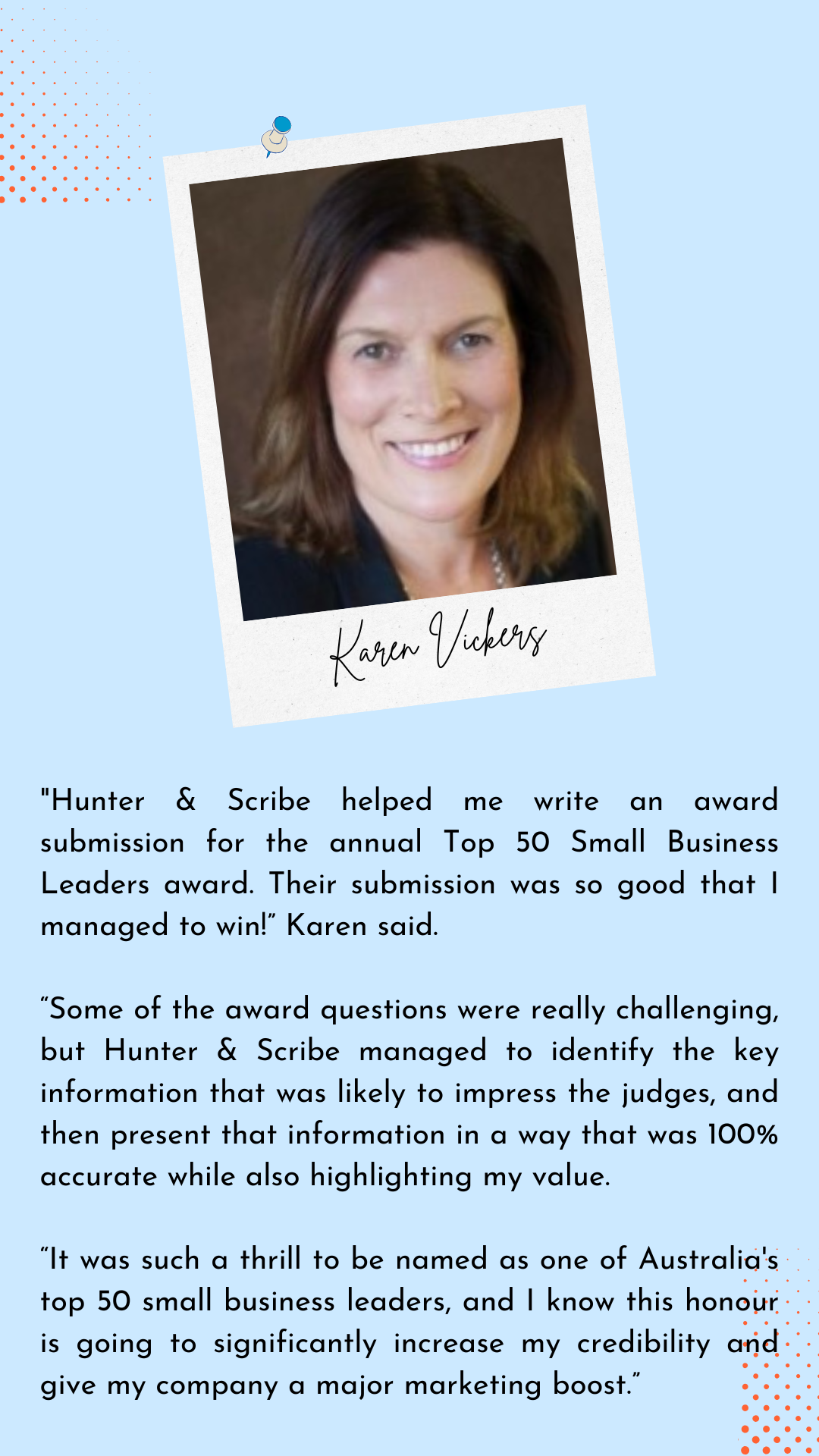 “Hunter & Scribe helped me write an award submission for the annual Top 50 Small Business Leaders award. Their submission was so good that I managed to win!” Karen said.