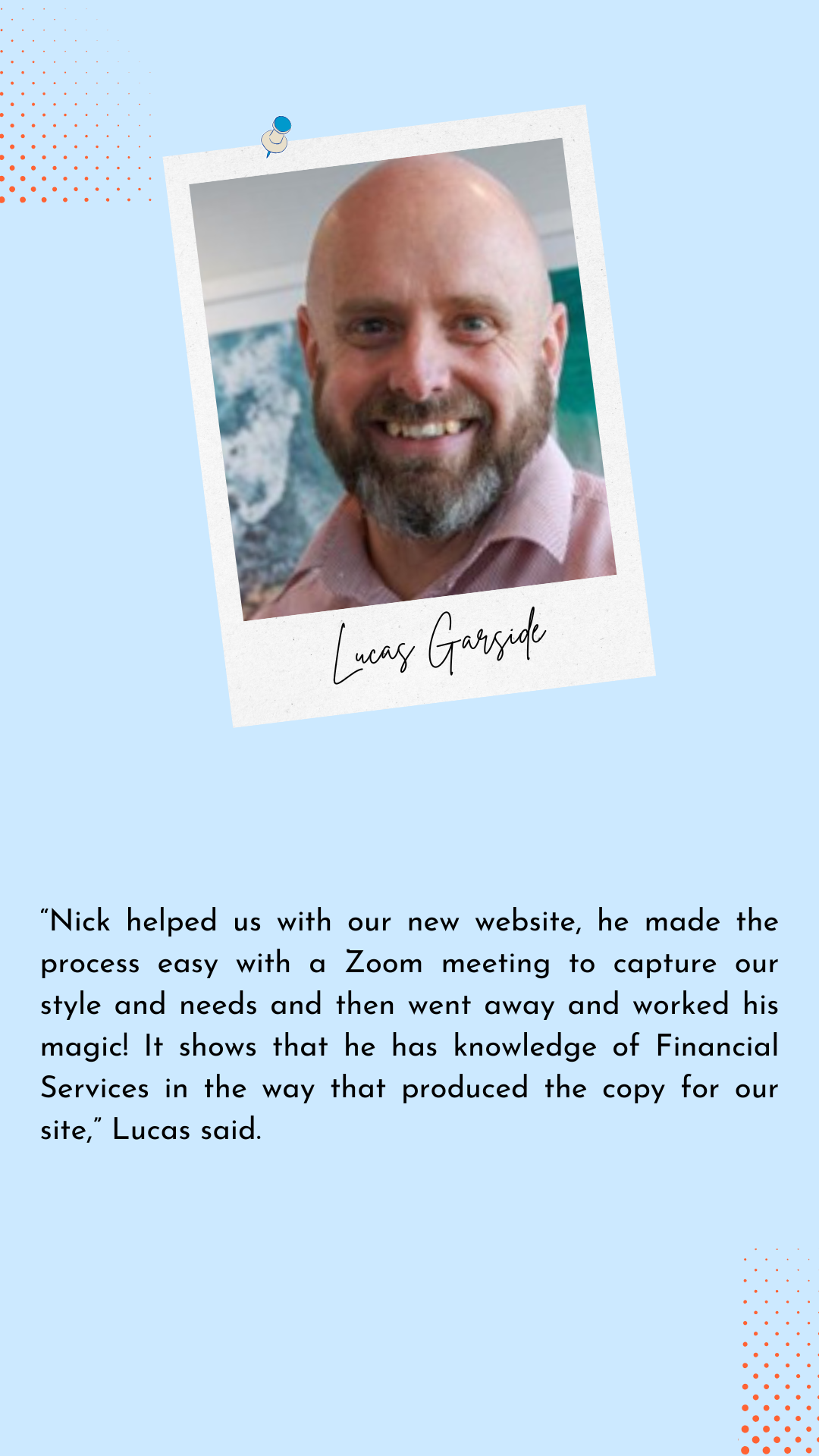 “Nick helped us with our new website, he made the process easy with a Zoom meeting to capture our style and needs and then went away and worked his magic! It shows that he has knowledge of Financial Services in the way that produced the copy for our site,” Lucas said.