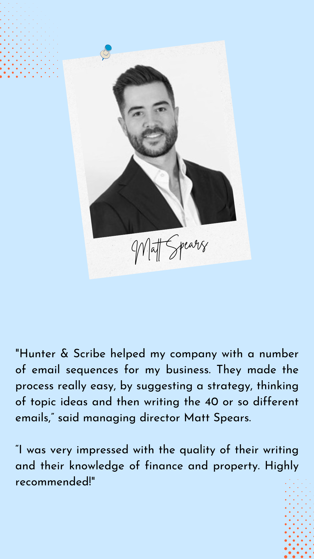 “Hunter & Scribe helped my company with a number of email sequences for my business. They made the process really easy, by suggesting a strategy, thinking of topic ideas and then writing the 40 or so different emails,” said managing director Matt Spears.